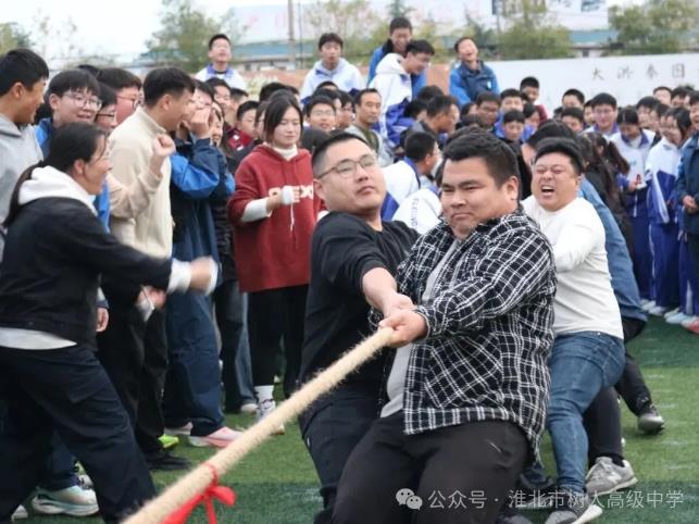 随着一声哨响,拔河比赛正式拉开帷幕!平日里传道授业的老师们放下粉笔,化身赛场上的“大力士”,他们紧握长绳、稳扎马步、全力后拉。场边啦啦队的助威声、欢呼声此起彼伏,现场热情高涨。