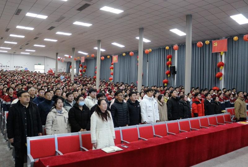 大会伊始,全体师生起立奏唱国歌,激昂的旋律点燃了现场的奋进氛围。